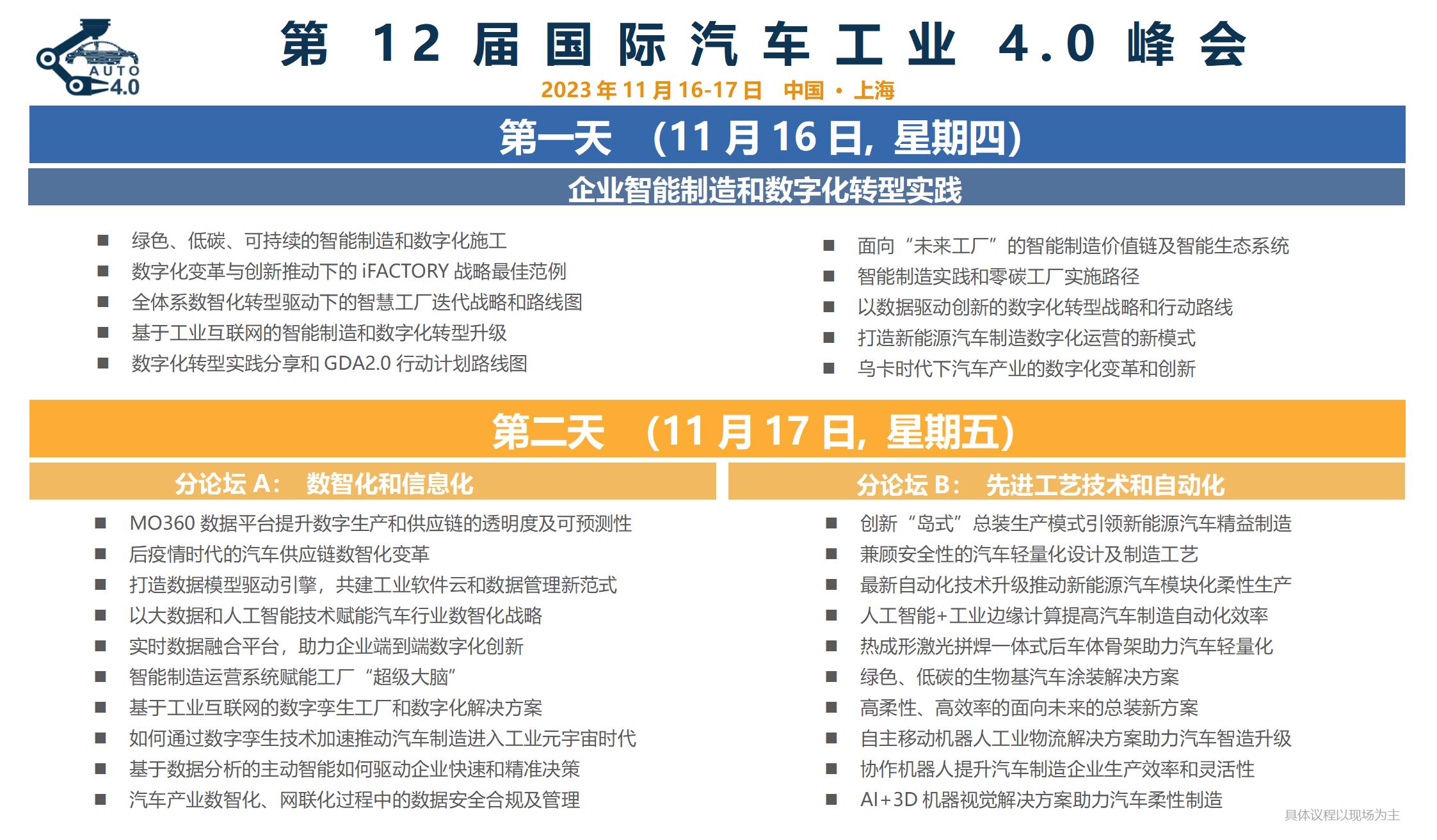 党的二十大指出,坚持把发展的着力点放在实体经济上,推进新型工业化;加快建设制造强国、网络强国,数字中国;推动制造业高端化、智能化、绿色化发展,促进数字经济和实体经济深度融合… …汽车行业作为高端制造业的典范,积极相应国家的号召,紧跟时代的步伐,不断开展智能制造和数字化转型的实践,并将新一代信息技术与先进制造技术深度融合,持续驱动汽车产业工业4.0的发展和变革。在此时代浪潮的推动下,第十二届国际汽车工业4.0峰会将围绕智能制造、智慧工厂、企业数字化转型实践、数智化和信息化技术发展、先进制造工艺和自动化生产等关键领域和先进技术展开讨论,旨在为参会人员提供一个学习交流和商务合作的专业平台。